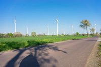 A rural road in Germany, surrounded by wind turbines. The clear sky and bright sun highlight the picturesque European landscape. The asphalt road leads the way to the windmill-dotted countryside.
