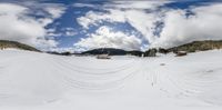 a snow covered ski slope with a skiier skiing on it with trees and mountains in the distance