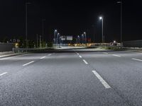 the empty highway is lit up at night time near a stadium or stadium complex with lights