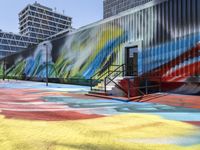 A vibrant cityscape in Berlin, Germany, showcasing the intersection of modern architecture and street art. Multicolored graffiti walls adorn urban warehouses, creating an art district in the heart of the metropolitan area.