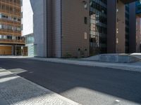 Modern architecture in Berlin's business district. Office buildings cast hard shadows on urban alleyways. Clear sky contrasts with the city life hustle. A typical European urban design scene in Germany.