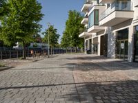 This stock photo features a paved courtyard in front of an office building near a park filled with benches and trees. The cityscape of Berlin, Germany is captured from a straight down the road perspective. The clear sky enhances the modern architecture and urban design of this residential area. The cobblestone road adds to the charm of the city, making it a perfect depiction of Berlin's city life in Europe during the day.