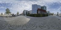 A man skateboarding in front of a modern office building in Berlin, Germany. The clear day showcases the city's urban design and modern architecture. The grey asphalt road and green grass create a vibrant contrast.