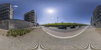 A panoramic view of a modern residential area in Bremen, Germany. Large buildings with a mix of brick and modern architecture line the straight driveway. Several cars are parked along the road, creating a symmetrical scene. Clear sky and urban infrastructure complete the cityscape.