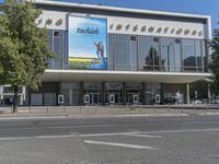 Modern architecture in Berlin, Germany. The mixed-use building with glass fronting on both sides of the street features a large 'techclr' poster. Clear skies highlight the urban facade in the heart of Europe.