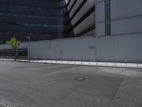 A monochrome view of a modern office building in Berlin, Germany. The sleek facade and concrete structure embody the city's urban design. The black fence lining the road contrasts with the vibrant city life.
