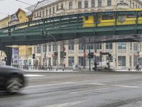This is an image of a snowy day in Berlin, Germany. The photo captures the city's architecture with buildings, houses, and office buildings covered in snow. A bridge and an underpass can be seen, along with a tram and automobiles driving on the snowy roads. The grey sky adds to the winter atmosphere of the urban landscape. The infrastructure, including roads and bridges, showcase the city's urban design. This photo represents a typical winter day in Berlin, showcasing the blend of architecture and urban life against a snowy backdrop.