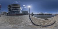 A circular shot of buildings near a river in Bremen, Germany. The cityscape showcases modern architecture and classic buildings. Clear sky and sunny weather illuminate the urban landscape.