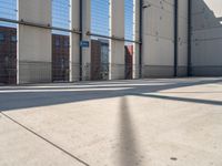 A modern architecture parking garage in Berlin, Germany. The concrete street features several small sections with hard shadows. The open space in front of the garage is fenced off, with urban design elements. A typical city scene in Europe.
