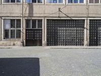 This is an image of a classic architecture building in Berlin, Germany. The cityscape showcases a busy street with cobblestone road surface and asphalt. The facade of the building is highlighted, displaying a line of windows and doors, along with an iron gate in the courtyard. The hard shadows add depth to the urban design. This photo represents the vibrant city life in Berlin, blending classic architecture with industrial elements. The warehouse in the background symbolizes the city's art district. It is a representation of the urban landscape and real estate in Europe.
