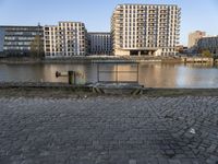 A modern urban design in Berlin, Germany. The high-rise buildings and clear sky create a stunning cityscape near the river. A peaceful courtyard with a bench offers a tranquil escape in this bustling metropolitan area.