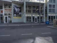 A cloudy day in Berlin with an empty building on a street corner. Modern and classic architecture blend in this urban neighborhood. Property for sale signs and an advertisement highlight the real estate opportunities in this popular tourist attraction.