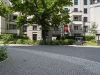 A modern residential building in Berlin, Germany. The architecture blends seamlessly into the city's urban design. The neighborhood features tree-lined streets and cobblestone roads. A snapshot of city life in Europe.