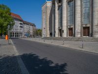 Classic architecture in Berlin, Germany. Urban design featuring hard shadows and clear skies showcasing the Volksbühne theater. City life on an asphalt road with distinct architectural elements.