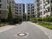 A view of a modern architectural residential building in Berlin, Germany. The straight road leads to a clear sky, surrounded by high-rise condominiums. Cobblestone flooring and urban vegetation add to the city's charm.