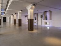 This is an image of an industrial warehouse turned art district in Berlin, Germany. The interior design features concrete surfaces, exposed columns, and high ceilings, creating a modern urban atmosphere. The room is filled with natural light, illuminating the unique artwork and creating a vibrant and lively ambiance. The venue has become a popular tourist attraction, showcasing the blend of industrial and urban design. This photo captures the essence of city life in Berlin and represents the thriving art scene in Europe.