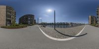 A modern urban landscape in Germany with buildings along a cobblestone road. The road leads to a pier and harbor with a panoramic view of the ocean. The brick buildings and straight road create a picturesque scene against the clear sky.
