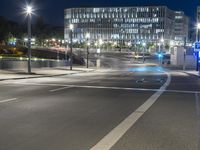 A night view of Berlin, Germany showcasing its modern architecture and urban infrastructure. The city streets are illuminated with artificial lights, creating a captivating atmosphere. The road surface and vegetation add to the overall aesthetics.