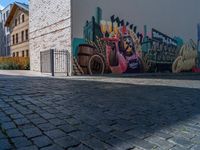 This image captures the vibrant city life of Berlin, Germany. The photo showcases a cobblestone road lined with urban design elements and graffiti walls. The city's famous East Side Gallery, a section of the Berlin Wall covered in colorful artwork, casts dramatic shadows. In the foreground, a bustling restaurant and bar provide a glimpse into the city's food and nightlife scene. This photo represents the lively atmosphere and unique urban culture of Berlin, offering a taste of Europe's dynamic city life.