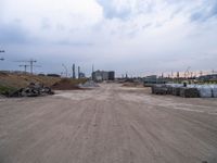 a dirt road going to construction next to some buildings on a hill under a cloudy sky