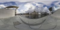 the fisheye image shows an outside area and water area, with a boat dock at one side