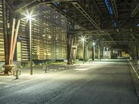 an empty city street under a bridge at night, with street lights on at either end