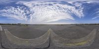An expansive view of Tempelhof Airport in Berlin, Germany. The large empty runway stretches into the distance, framed by clear skies and fluffy clouds. The symmetrical architecture of the airport's buildings adds to the urban design of the area.