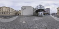 A fish-eye view of Berlin's modern architecture in the business district. Cobblestone streets contrast with sleek office buildings. Open spaces and plazas provide a dynamic urban atmosphere in the heart of Europe.