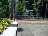 a red fire hydrant sitting outside of a large glass building next to grass and trees