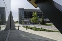 a person walking down a walkway near a glass building, next to a sidewalk and walkway