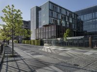 This is an image of a modern residential building in Berlin, Germany. The architecture is characterized by its glass facade and sleek design, reflecting the city's urban and contemporary style. The building is located in a mixed-use residential area, surrounded by trees and cobblestone roads. The clear sky above accentuates the modernity of the metropolitan area. In the foreground, a public space is visible, providing a serene visual contrast to the bustling city life. This photo captures the essence of Berlin's urban design and serves as a representation of its vibrant business district.