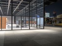 This is an image of a modern architecture building located in the heart of the financial district in Berlin, Germany. The building features a glass facade with a lot of windows that allow for ample natural light during the day and a stunning view of the city at night. The concrete flooring and open space create a sense of urban design, while the artificial lights illuminate the surroundings, adding to the city's vibrant atmosphere. This building is a prime example of mixed-use urban architecture and represents the bustling city life in Berlin.