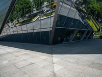 This is an image of a large silver building in Taipei City, Taiwan. The modern architecture features glass and metal walls, creating a futuristic design. The glass windows and mirrors reflect the clear sky above, while the hard shadows cast by the building provide shade on the sidewalk below. The urban environment showcases Taipei's urban design and city life. This photo represents a typical day in Taipei, with its innovative buildings and open spaces.