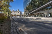 This image showcases the modern architecture of Ottawa, Canada. The cityscape features skyscrapers and office buildings surrounded by a residential area. The clear sky overhead contrasts with the glass walls of the buildings. The road, lined with trees and vegetation, leads through the business district, with asphalt and curbs defining the thoroughfare. The scene captures the urban design and vibrant city life of Ottawa. The futuristic architecture and hard shadows reflect the modernity of the city. This photo represents a typical day in the bustling capital of Canada.