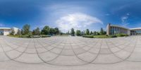 A fish-eye view of a modern glass-walled business district in Berlin, Germany. The clear sky reflects on the glass surface of the office buildings and university campus. Straight roads lead to the financial district and museum. A glimpse of Europe's architectural prowess.
