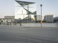 This is an image of a city street in Berlin, Germany during the break of day. The modern architecture of the glass building reflects on the asphalt road, giving the scene a sleek and contemporary feel. In the foreground, bicycles can be seen, representing the city's bike-friendly culture. The clear sky adds to the metropolitan atmosphere of the scene. This photo captures the essence of city life in Berlin, showcasing the urban design and high-rise buildings that dominate the city's skyline.