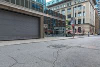 A view of a city street in Toronto, Canada. The urban landscape is characterized by busy roads, glass walls of cafes and bars, and metal walls. The bustling city life is evident in the parked cars and urban design.