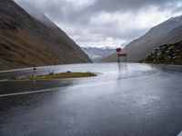 A gloomy day in Austria, with grey skies looming over a winding road surrounded by dramatic landscape. The wet road surface adds to the dramatic effect, reflecting the gloom of the surroundings.