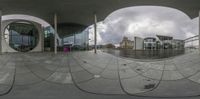 the 360 - fisheye lens is pointed at the circular building's exterior as well as a person riding an orange bike