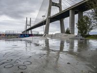 This image captures the urban landscape of Lisbon, Portugal on a gloomy day. The grey sky sets a moody tone and contrasts with the city's architecture and concrete surfaces. The graffiti wall adds a touch of urban art to the scene. In the foreground, a skatepark and bridge can be seen, showcasing the city's open spaces and underpasses. Surrounding the cityscape are trees and vegetation, adding a touch of nature to the urban design. The image captures the essence of city life in Lisbon, with its blend of architecture, water, and graffiti.