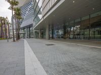 An office building in the heart of a gloomy business district. The grey sky reflects the gloominess of the city. The tree-lined road surface adds a touch of nature to the urban design.