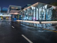 This stock photo showcases a gloomy cityscape in Guangzhou, China. The image features a modern architecture, specifically an office building and a cafe with neon lights illuminating the street. The asphalt road and wet surface reflect the artificial lights, creating a futuristic and urban atmosphere. The grey sky and rain add to the overall gloomy ambiance. The image highlights the vibrant city life and urban design of Guangzhou, a metropolitan area in Guangdong province, China.