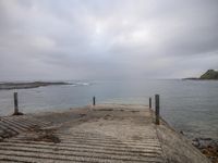 an empty boat dock is under cloudy skies over the sea water at low tide point