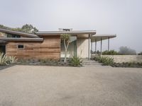 A gloomy dawn in California's residential area. Modern architecture homes contrast with the grey sky and fog. Suburban villa situated in the vineyard, with a composite material roof. A serene and gloomy morning in Monterey.