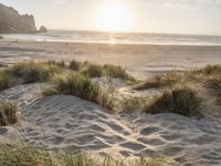 A gloomy dawn at the coast of California, with fog covering the sandy beach. The grey sky creates a gloomy atmosphere, but the sun is visible beyond the clouds, promising sunshine later in the day.