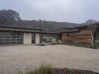 A gloomy dawn breaks over a suburban residential area in Los Angeles. Modern architecture blends with traditional houses. Concrete roads and open spaces contrast with lush gardens and vineyards.