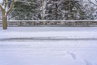 A gloomy dawn in rural Ontario, with a grey sky and snow-dusted landscape. The road winds through residential areas with houses nestled among trees. Vegetation, fences, and tree trunks line the asphalt road. A typical winter day in Toronto.