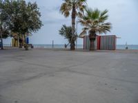 Gloomy day in Barcelona with a grey sky and limited greenery. Concrete coastline contrasts with the open space of the beach. Palm trees and the ocean create a serene atmosphere. Explore Europe's coastal beauty.