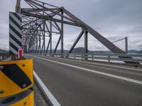 A gloomy day with a grey sky over a road surface leading to a bridge. The river flows underneath as the Armco barrier and guard rail protect the thoroughfare. Hills and water add to the scenic view.