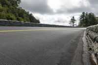 A gloomy day on the road, with grey skies overhead. The asphalt thoroughfare winds through a lush landscape, flanked by dense forest and green vegetation. A stone retaining wall runs alongside, while a person skates along the road.